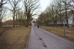 Nach Verlassen der U-Bahn geht es geradeaus durch den Park mit der Disc-Golf Anlage auf die große Fußgängerbrücke.