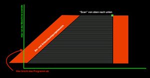 Der Scan-Modus benötigt einen gewissen Bereich zum Beschleunigen und bremsen (im Bild rot). Wenn das Werkstück zu nah am Rand der Maschine (grün) positioniert wird und nicht mehr ausreichend Platz zum Beschleunigen zur Verfügung steht, startet das Programm zwar, bricht dann aber ab, sobald das Problem auftritt.