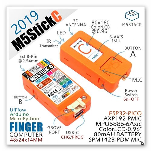 5V DC-Stromversorgung USB Typ-C ESP32-basiert Gehäuse-Material: PC + ABS 4 MByte Flash 6-Achsen-IMU: MPU6886 Rote LED IR-Sender Mikrofon 2 Tasten, LCD(0,96 Zoll), 1 Reset 2.4G-Antenne: Proant 440 80 mAh-Lipo-Batterie Erweiterbare Anschlussbuchse Grove Anschluß Tragbar & Wandmontage Entwicklungsplattform UIFlow, MicroPython, Arduino Produkt mit Abmessungen:48.2mm x 25.5mm x 13.7mm Produkt Gewicht:15.1g