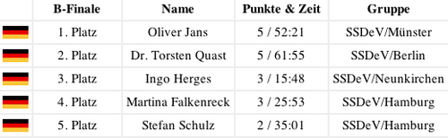 Die Sieger 2011 Zum zweiten mal wurde auf dem Hamburger Trainingslager zu Pfingsten der Wettkampf Impressionstechnik nach den neuen Regeln durchgeführt. Von 20 Wettkämpfern öffneten in der Vorrunde 11 Sperrsportler. Die ersten sechs qualifizierten sich mit unter 10 Minuten Öffnungszeit für das A-Finale. Mit einer Öffnungszeit zwischen 26 und 50 Minuten erreichten fünf Wettkämpfer das B-Finale. Zum zweiten mal nach Barry Wels 2008 hat sich ein Niederländer den Deutschen Meistertitel geholt.
