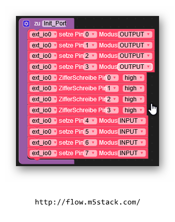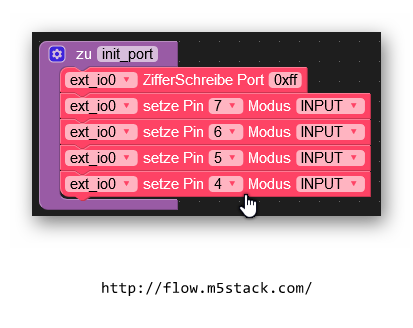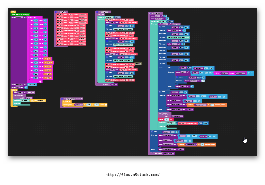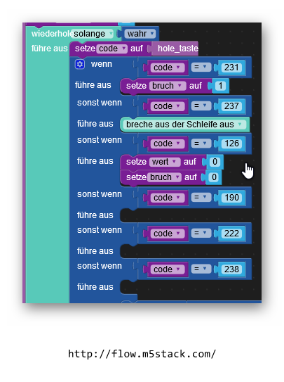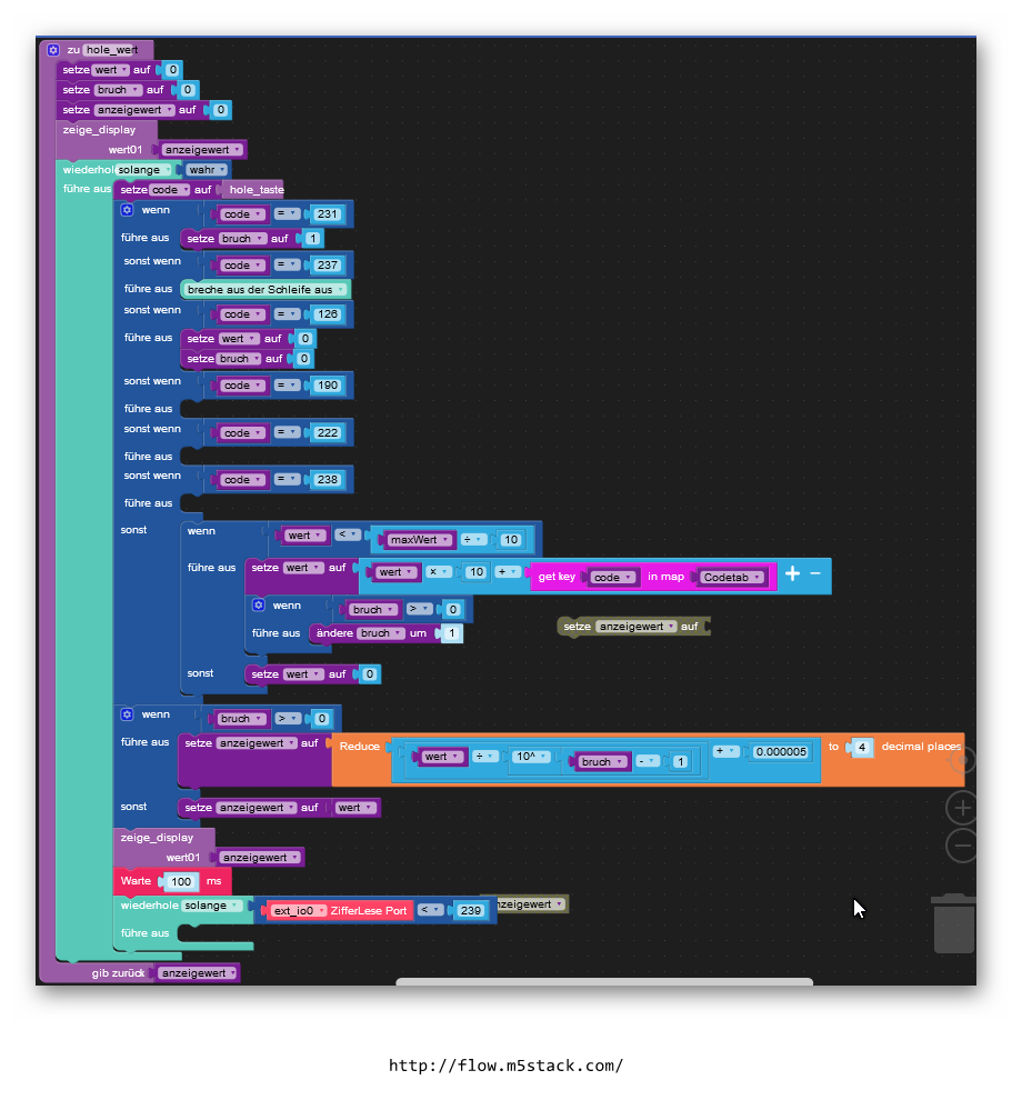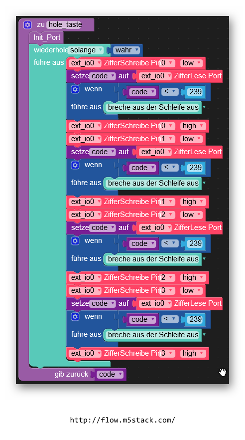 Nun werde ich zeigen, wie ich dieses Prinzip mit Blockly umgesetzt habe. Zuerst einmal möchte sagen, dass Blockly keine Blöcke zur Bitmanipulation bereitstellt, deshalb wirkt das Programm an einigen Stellen umständlich. Ich will auch nicht behaupten, dass dieses Programm in irgend einer Weise vorbildlich wäre. Es ist nur mein Versuch eine 4x4-Matrix-Tastatur zur Werteeingabe mit dem M5StickC zu benutzen.