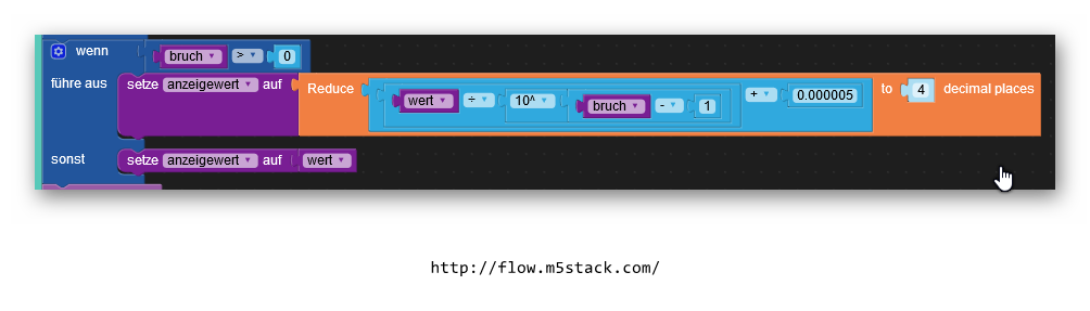 Nun muss aus Zahlenfolge und der Anzahl der Nachkommastellen der korrekte Wert erzeugt werden. Dazu wird die Zahlenfolge wert durch einen Faktor geteilt, der der Anzahl Nachkommastellen entspricht (10^(bruch-1)). Der Additionswert 0,000005 dient der Rundung der angezeigten Zahl. Bekanntlich entstehen Ungenauigkeiten, wenn man gebrochene Binärzahlen in Dezimalzahlen umwandelt. Dieser Effekt soll dadurch reduziert werden. Eigentlich müsste dazu bei 4 Nachkommastellen 0,00005 der richtige Wert sein. Dieser brachte aber häufiger 1 in die letzte Stelle die 0 sein sollte. Ganze Zahlen werden ohne Nachkommastzellen angezeigt. Erst bei Eingabe des Kommas (*) werden auch Nachkommastellen angezeigt. Die Anzahl der Nachkommastellen muss leider fest vorgegeben werden. Ich hatte ursprünglich versucht die Anzahl der Nachkommastellen auf die eingegebene Anzahl zu begrenzen. Das funktionierte aber nicht, weil der Block keine Variablen bei der Anzahl der Nachkommastellen aktzeptiert.