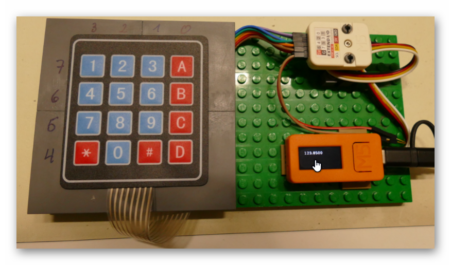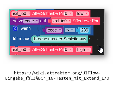 Dieses Programmungetüm ermöglicht es mit Blockly eine 4x4-Matrix-Tastatur abzufragen. Für die Verbindung zwischen der Tastatur und dem M5StickC dient die Unit Extend I/O. Die Abbildung oben entspricht nicht dem aktuellen Stand!