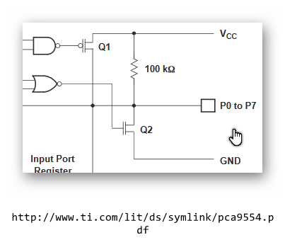 Das Bild aus dem Datenblatt des PCA9554PW zeigt die Beschaltung der PIN's. Q1 legt den Ausgang auf HIGH, Q2 auf LOW. Als Eingang sind Q1 und Q2 gesperrt, so dass der PIN über den 100kOhm Widerstand auf HIGH liegt. Einen Tastendruck können wir also nur mit einem LOW-Signal erkennen. Um eine Reihe zu scannen muss diese auf LOW gelegt werden. Dann wird die Spalte mit der gedrückten Taste auch LOW.