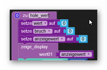 Die Funktion hole_wert tut das, was man bei ihrem Namen vermutet. Sie holt einen Wert von der Matrix-Tastatur. Dieser Wert wird an die Variable temp übergeben. Diese wird an die Funktion zeige_display weitergereicht. Diese Funktion zeigt den Wert auf dem Disolay an.