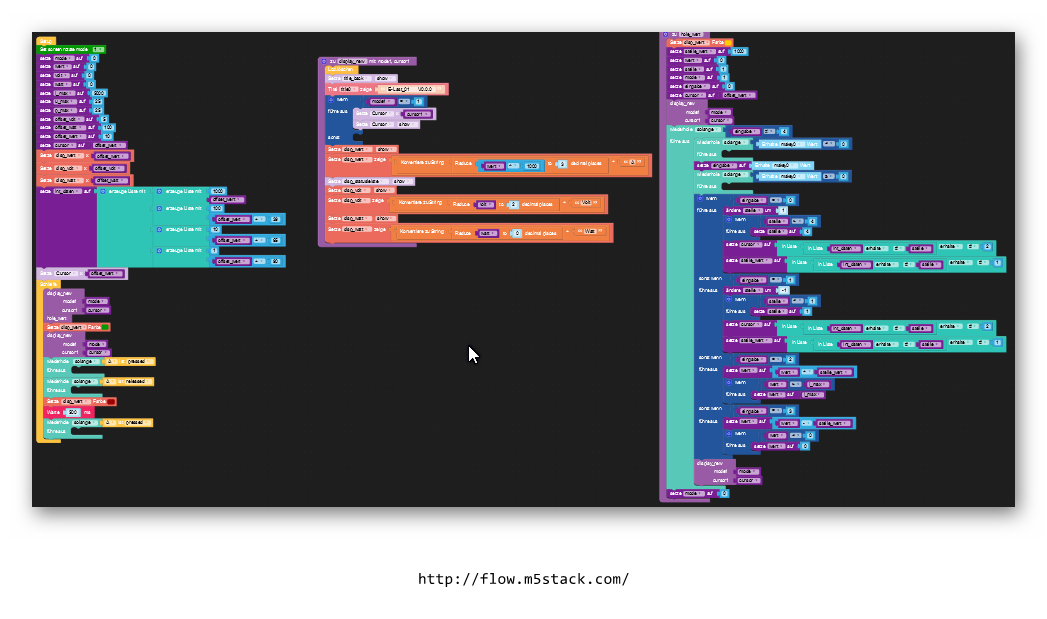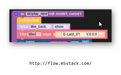 Zuerst wird das Display gelöscht. Dann wird mit dem Aufbau begonnen. Zuerst wird der blaue Balken hinter dem Titel gezeichnet und dann die Programmmeldung daraufgeschrieben. Diese Reihenfolge ist wichtig,da der Balken die Schrift sonst überdeckt. Die grafischen Elemente wurden mit dem Oberflächeneditor von UIFlow entworfen. Da das diese Editor die Ausrichtung auf dem Display nicht darstellt gestaltet sich der ein wenig kompliziert. Beim Einsatz des Titelelements und gedrehtem Display wird nur ein 80px breiter blauer Balken erzeugt. Deshalb habe ich diesen per dazugesetzt.
