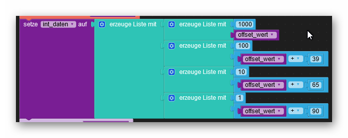 Diese Liste enthält 4 Einträge, die den Stellen der einzugebenen Zahl entsprechen, wobei Stelle 1 ganz links liegt. Jeder dieser 4 Einträge erhält wieder eine List mit 2 Einträgen, die den Wert der Stelle und die X-Position des Cursors unter der Stelle beinhalten. Die Werte der Cursor-Positionen wurden durch ausprobieren ermittelt.