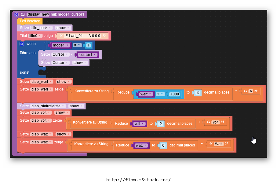 Anschliessend erfolgt die Anzeige des aktuellen Wertes. "Anzeige disp-wert show" ist erforderlich, damit der Wert auch sicher angezeigt wird. Ohne diesen Block hängt die Anzeige von irgendwelchen anderen Einflüssen ab. Ich habe hier den internen Wert für den Strom (mA) noch durch 1000 geteilt, weil ich die Anzeige in Ampere darstellen wollte.