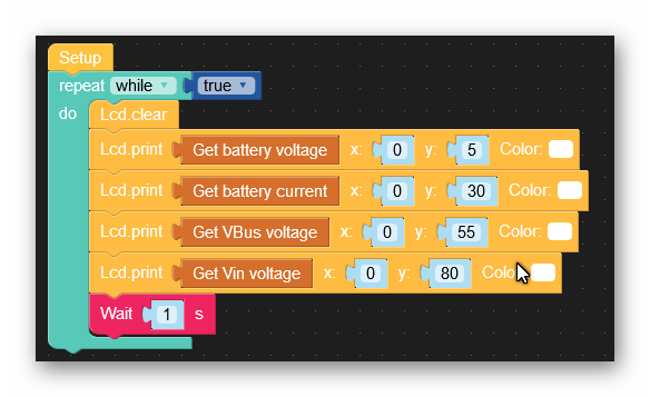 Ein erstes Testprogramm(POW-001.m5f)das die Akkuspannung, den Akkustrom, die Spannung vom USB-Anschluss und die eine eventuelle 5V-Versorgungsspannung von der Buchsenleiste anzeigt könnte so aussehen: