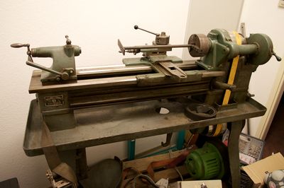 Dirk hat uns seine Drehbank gespendet. Sie ist von Beling & Lübke und scheint aus den 30er-Jahren zu kommen. Sie wird wahlweise mit einem 1000W-Elektromotor oder über Transmission mit unserer zentralen Dampfmaschine angetrieben.