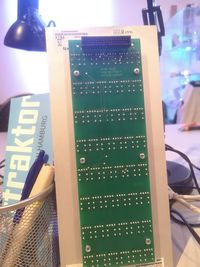 Die Buttons sind in einem Raster von 6x8 auf einer Platine angeordnet. Jeder Button hat eine rote und eine grüne LED. Die Platine hat einen 34-poligen Anschluss für Flachbandkabel (IDC Connector). Da wir je Button insgesamt 4 und damit insgesamt 192 Pins bräuchten, muss der Hersteller wohl getrickst haben. *hust* Multiplexing *hust*. Nach einigem Durchpiepen mit dem Multimeter ließ sich herausfinden, wie das genau gelöst wurde. Es gibt 8 Channel-Pins, 16 LED-Pins und 8 Button-Pins. Die Channel-Pins werden nacheinander exklusiv mit Spannung versorgt und dabei werden jeweils einmal die 16 LED-Pins "beschrieben" und die 8 Button-Pins "ausgelesen". Durch die Verschaltung auf der Platine können dadurch je Channel 8 grüne LEDs, 8 rote LEDs und 8 Buttons versorgt werden. Von den dadurch möglichen 64 Buttons werden tatsächlich aber nur 48 gebraucht.