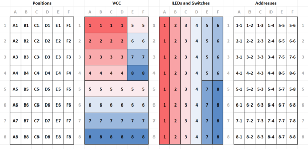 Die Positionen links im Bild sind das, was auf Anwenderseite sichtbar sein soll. Die mittleren Raster zeigen die Gruppierung der Channel-Eingänge (VCC) und der Buttons/LEDs. Daraus ergeben sich die Adressangaben auf der rechten Seite. Diese entsprechen der Form, wie sie auf Programmebene verwendet würden.